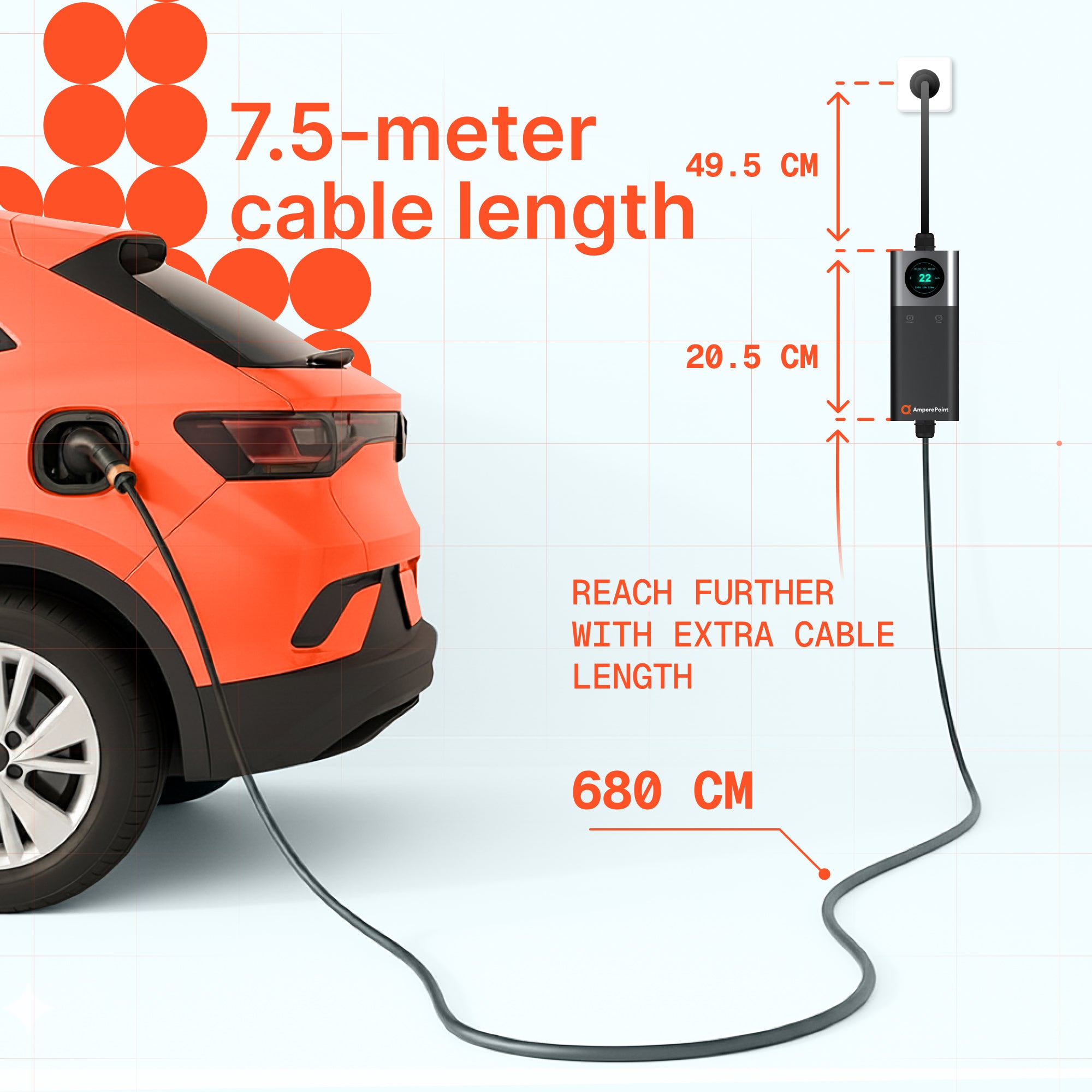Кабел с дължина 7,5 м осигурява удобно зареждане независимо от позицията на паркиране. Без стрес, без опъване на кабела и без необходимост да позиционирате колата си точно до контакта.