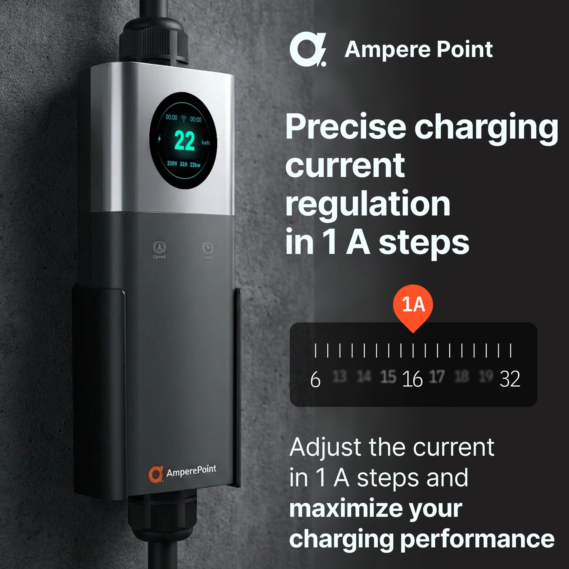 Регулируемият заряден ток в диапазона 6–32A (с нарастване от 1A) ви позволява да настроите мощността перфектно спрямо вашата електрическа инсталация и текущото натоварване в дома ви. Благодарение на прецизния контрол, можете безопасно да зареждате колата си дори при ограничена връзка.