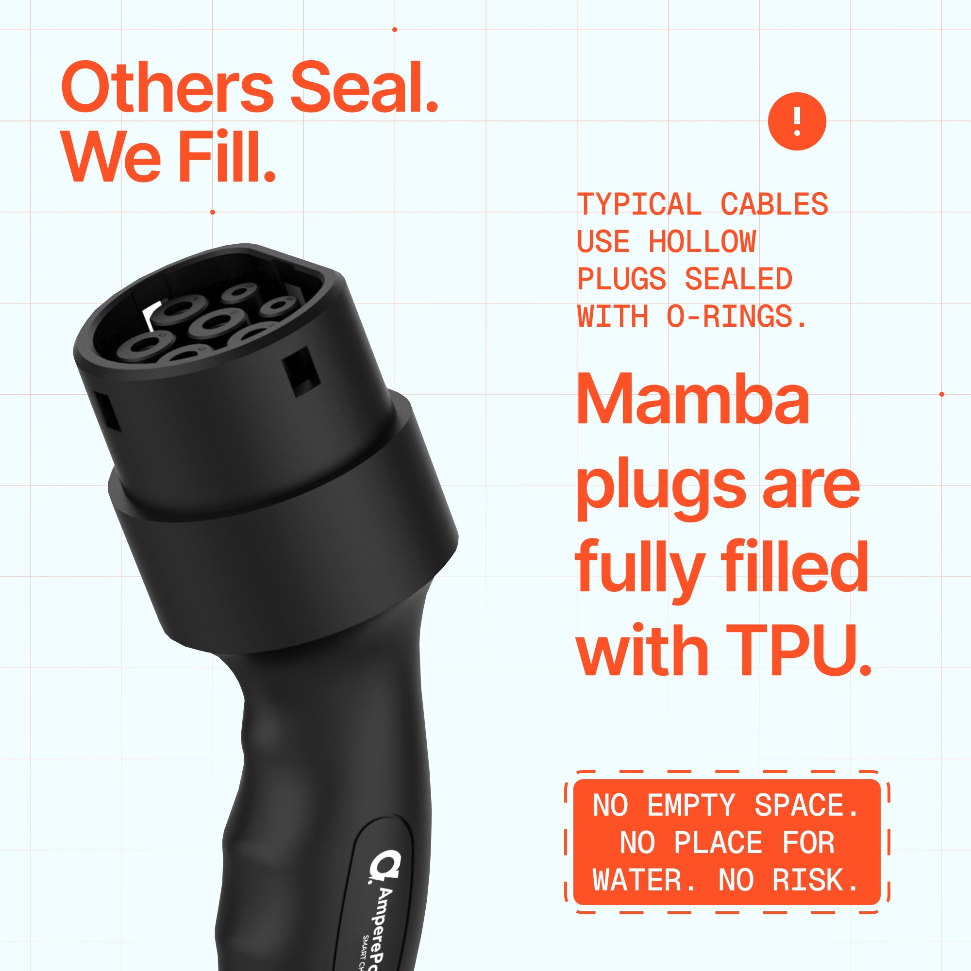 The plug interior is fully filled with TPU without air bubbles. Competition has hollow interiors sealed only with O-rings. Mamba has it filled - zero risk of water penetration.