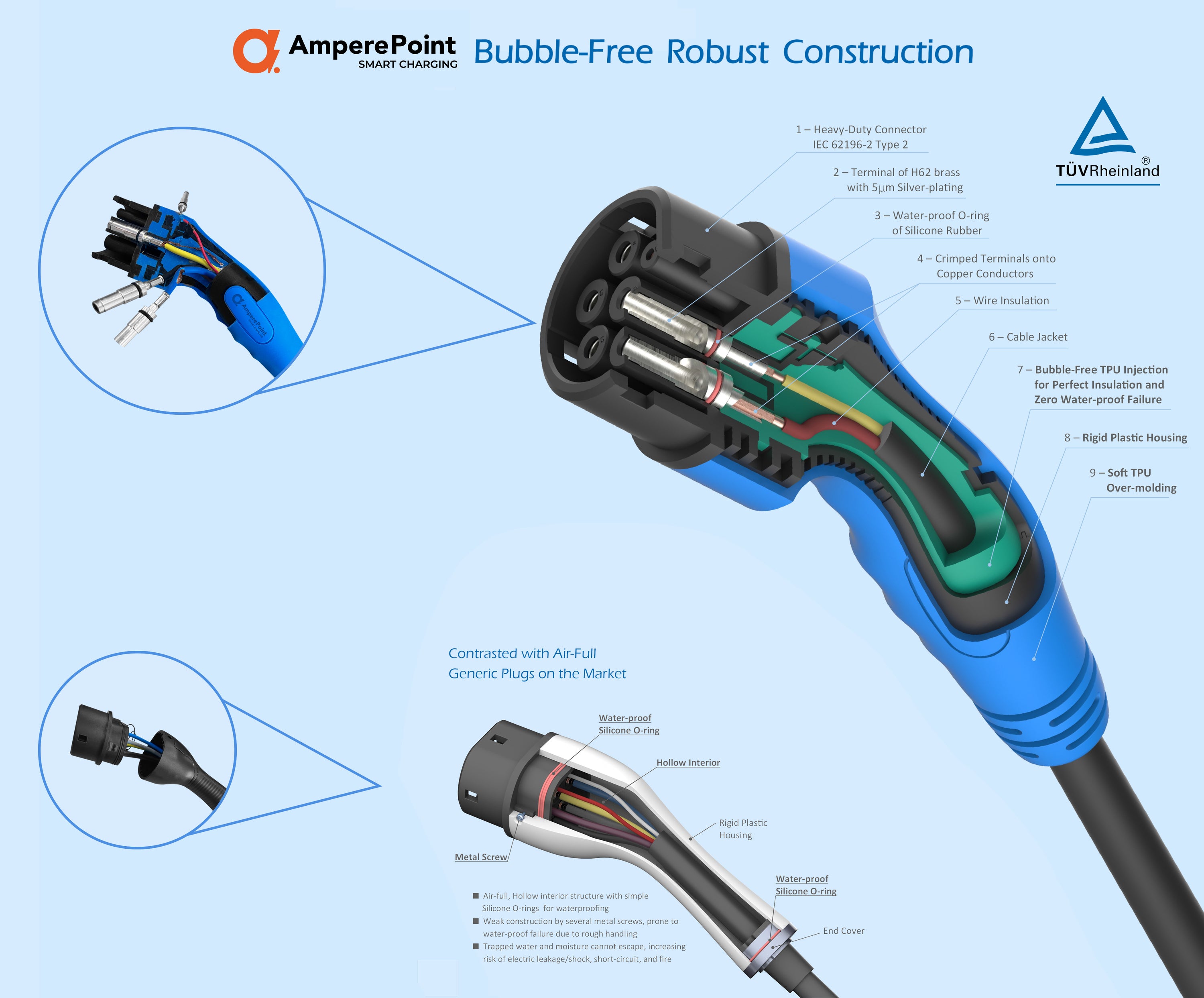 ✓ Bubble-Free TPU Injection – interior fully filled with TPU, zero empty spaces or air bubbles ✓ TÜV Rheinland Certified – safety confirmed by independent testing (not every cable has this) ✓ 10,000+ cycle lifespan – documented durability, a cable that lasts for years✓ Compatible with all Electric & Hybrid cars (Standard Type 2 plug)
