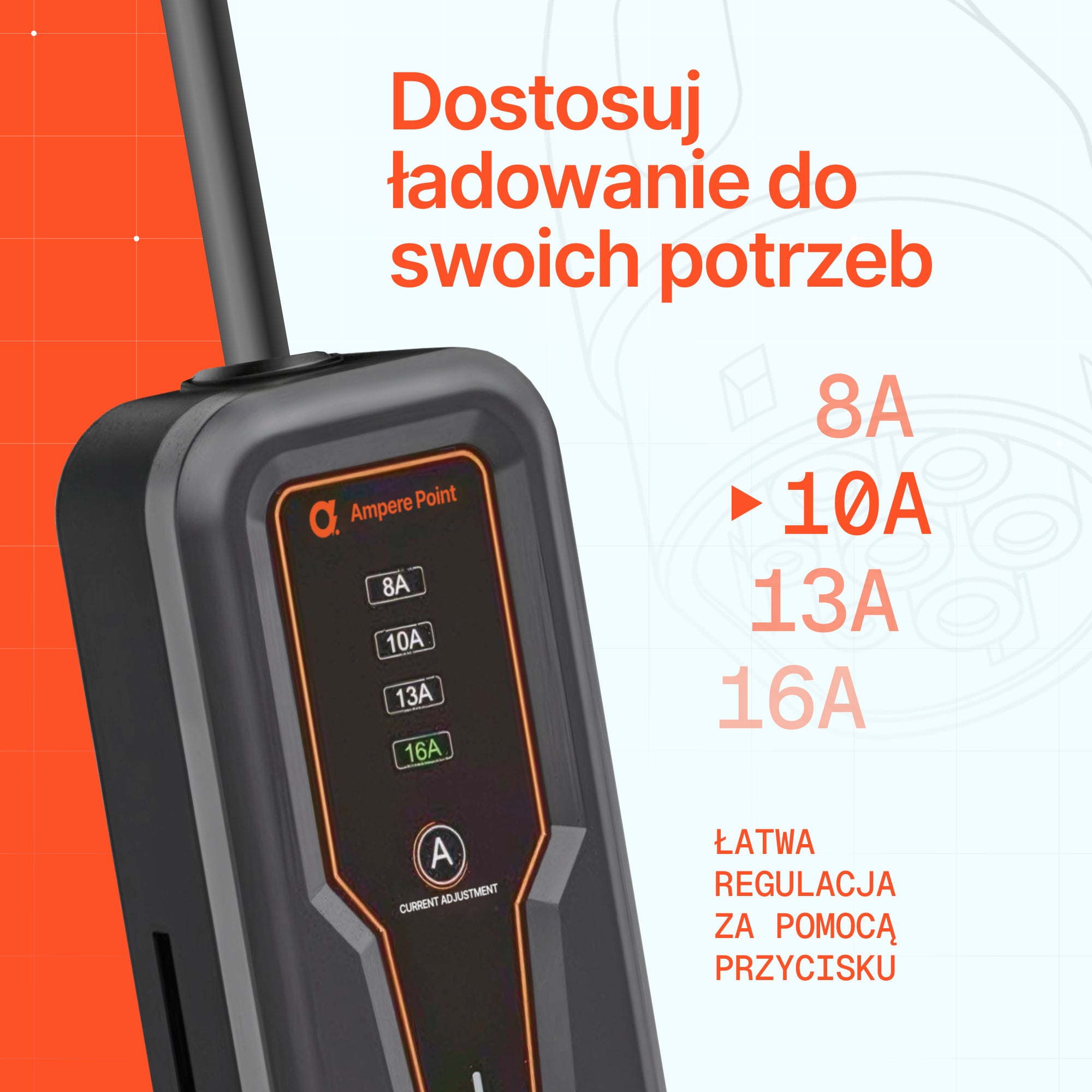 Features – Adjustable charging power (A - 8/10/13/16) to optimize energy consumption, with the charger memorizing the last used current (A) settings.