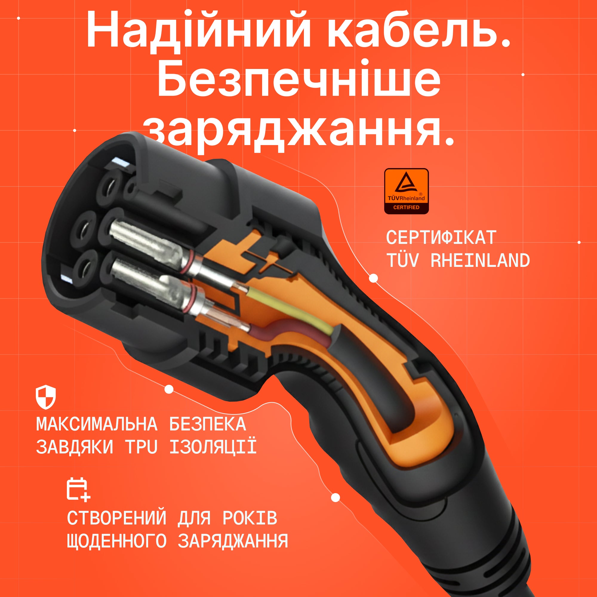 ✓ Вприскування TPU без бульбашок – внутрішня частина повністю заповнена TPU, без порожнин або повітряних бульбашок ✓ Сертифіковано TÜV Rheinland – безпека підтверджена незалежним тестуванням (не кожен кабель має це) ✓ Термін служби понад 10 000 циклів – задокументована довговічність, кабель, що служить роками✓ Сумісний з усіма електричними та гібридними автомобілями (стандартна вилка Type 2)
