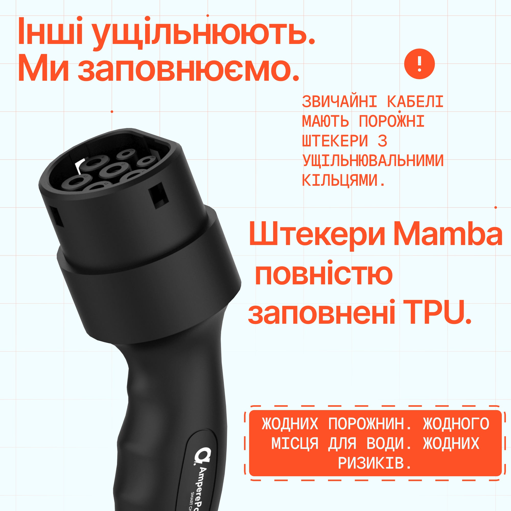 Внутрішня частина штекера повністю заповнена TPU без повітряних бульбашок. У конкурентів порожнисті внутрішні частини, ущільнені лише O-подібними кільцями. У Mamba вони заповнені – нульовий ризик проникнення води.