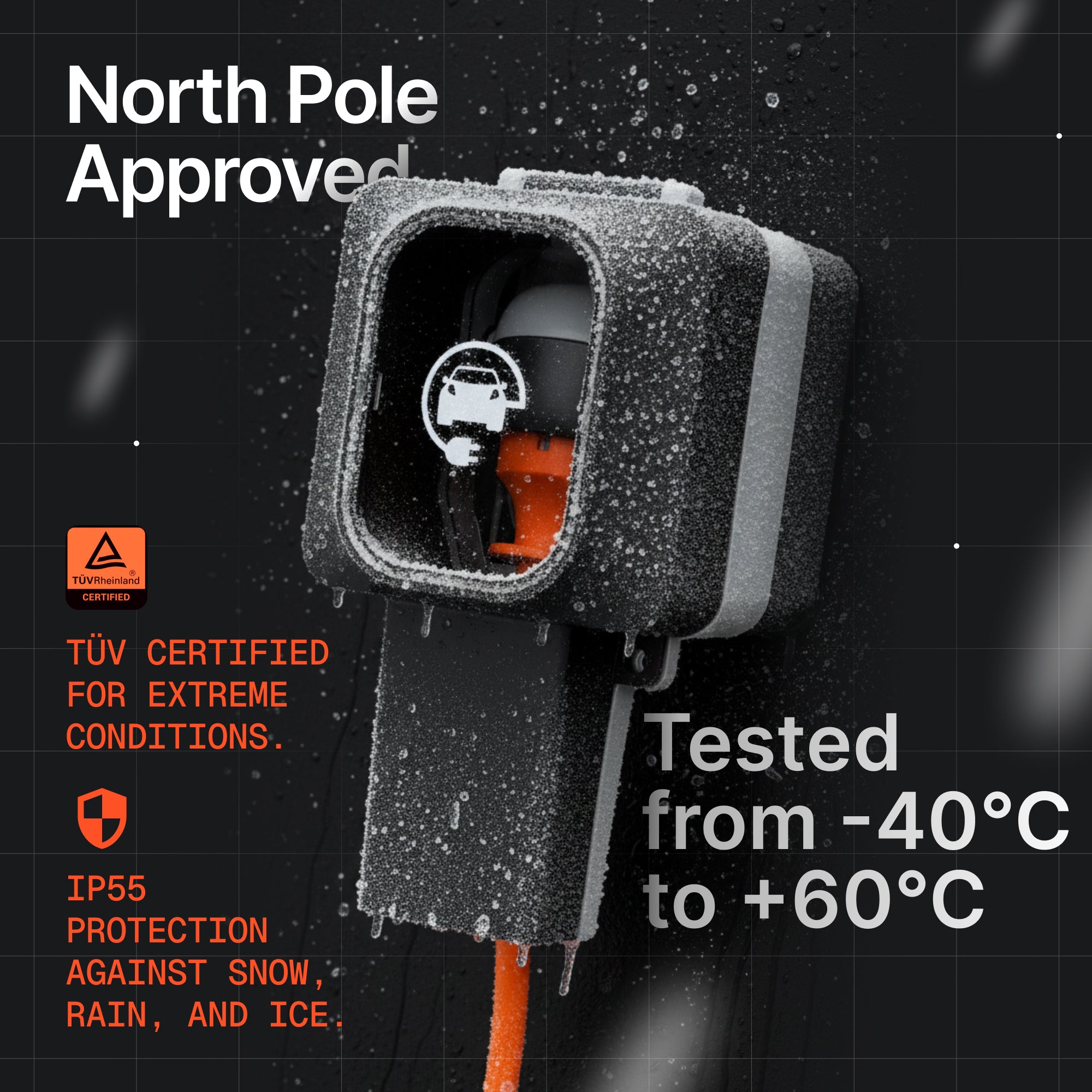 Сертифікат TÜV – це не просто наклейка на упаковці. Це німецька точність випробувань, що гарантує: виріб пройшов крізь пекло в екстремальних умовах і залишився неушкодженим. Захист IP55 означає повну пилонепроникність і стійкість до водяних струменів з будь-якого напрямку. Чи йде дощ, дме вітер, морозить чи палає спека до 60°C – Dr. Storm Socket просто працює.