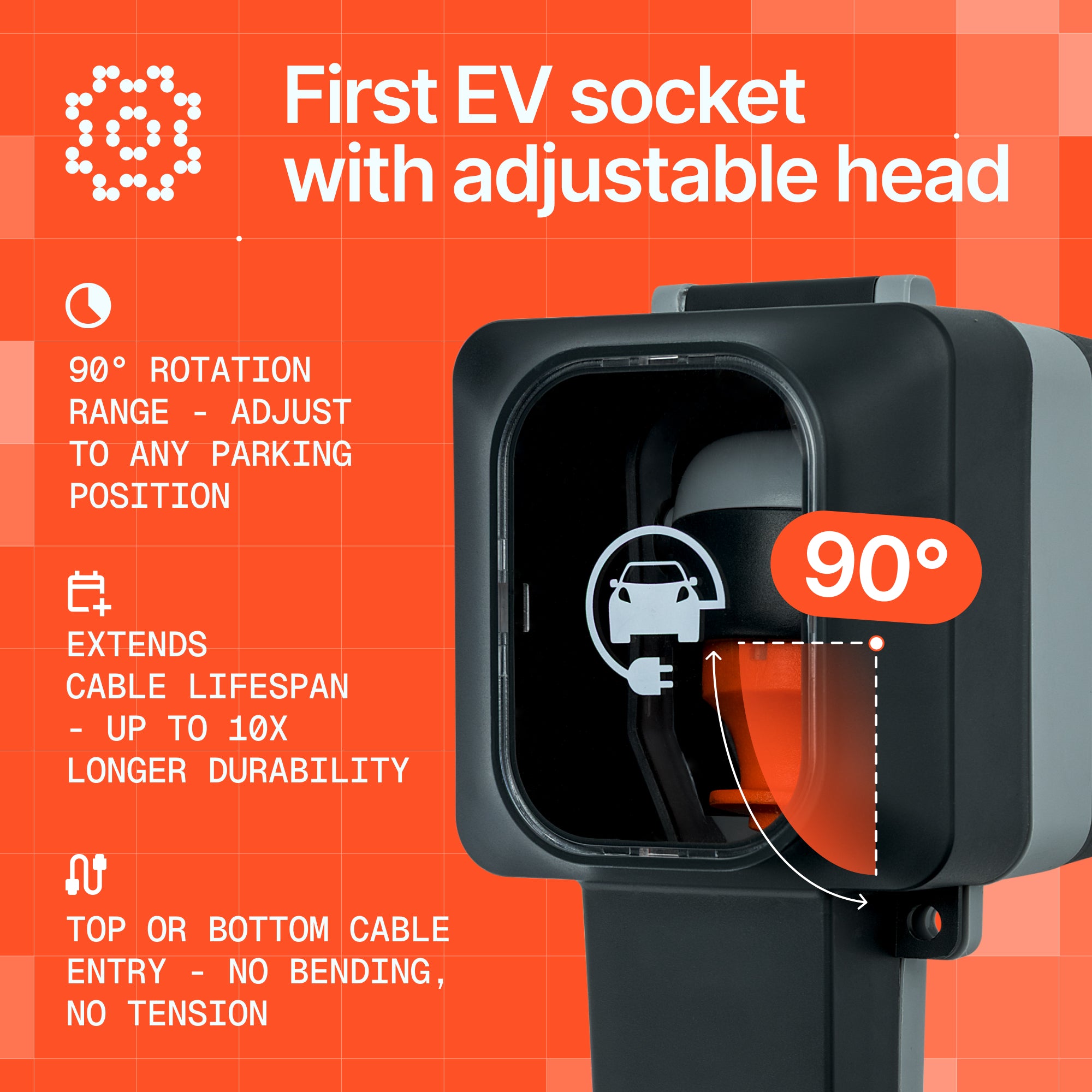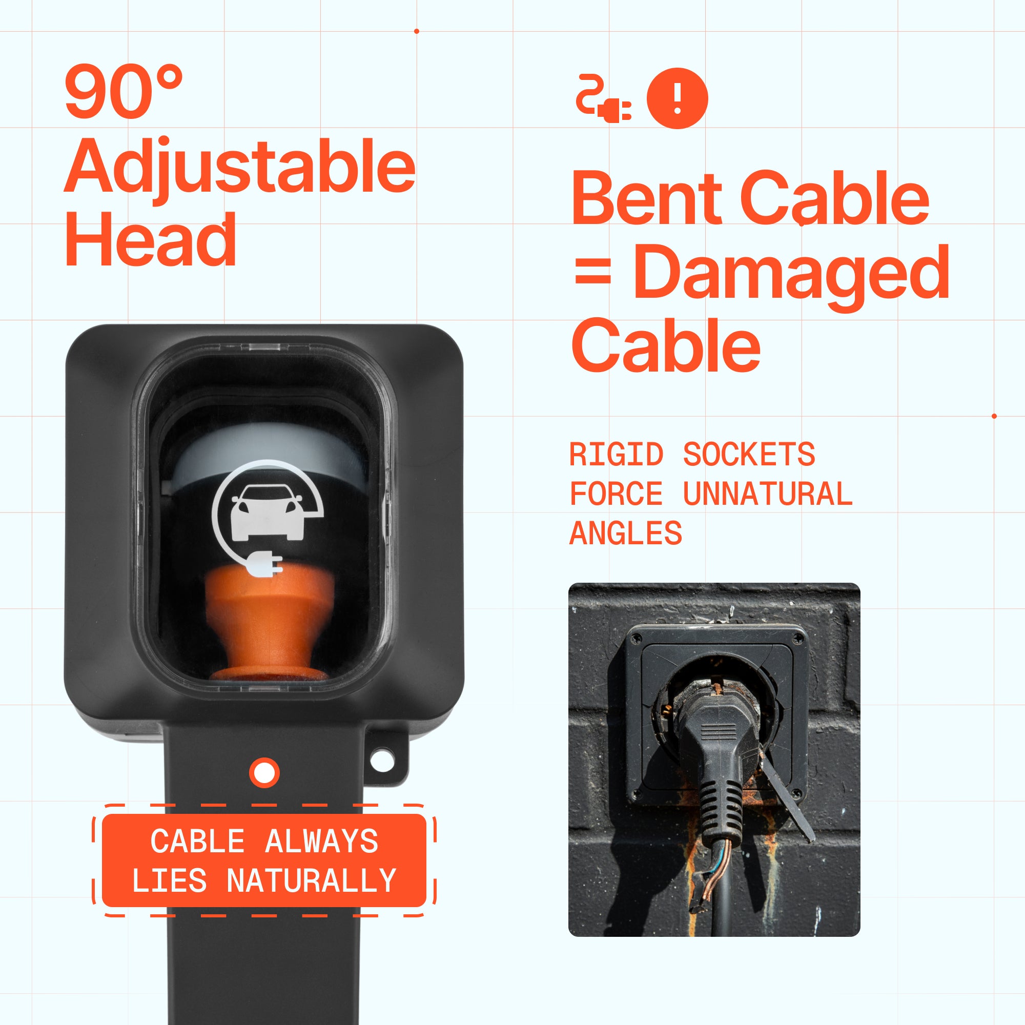 Dr. Storm Socket — перша на ринку розетка для електромобілів із регульованою головкою під кутом 90°. Одне просте налаштування — і ваш кабель завжди лежить природно, без вигинів, без напруги, без пошкоджень.