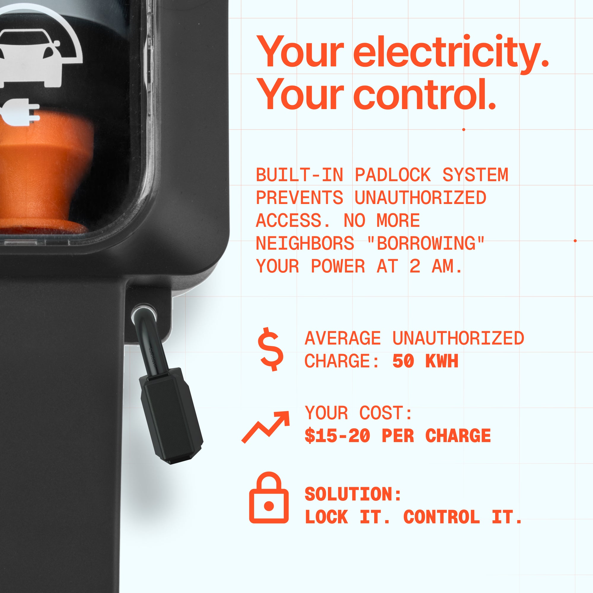 Ми обладнали Dr. Storm Socket системою безпеки з навісним замком. Просте рішення, яке дає вам повний контроль над тим, хто і коли має доступ до вашої електроенергії. Не покладайтеся на добру волю інших — захистіть своє.
