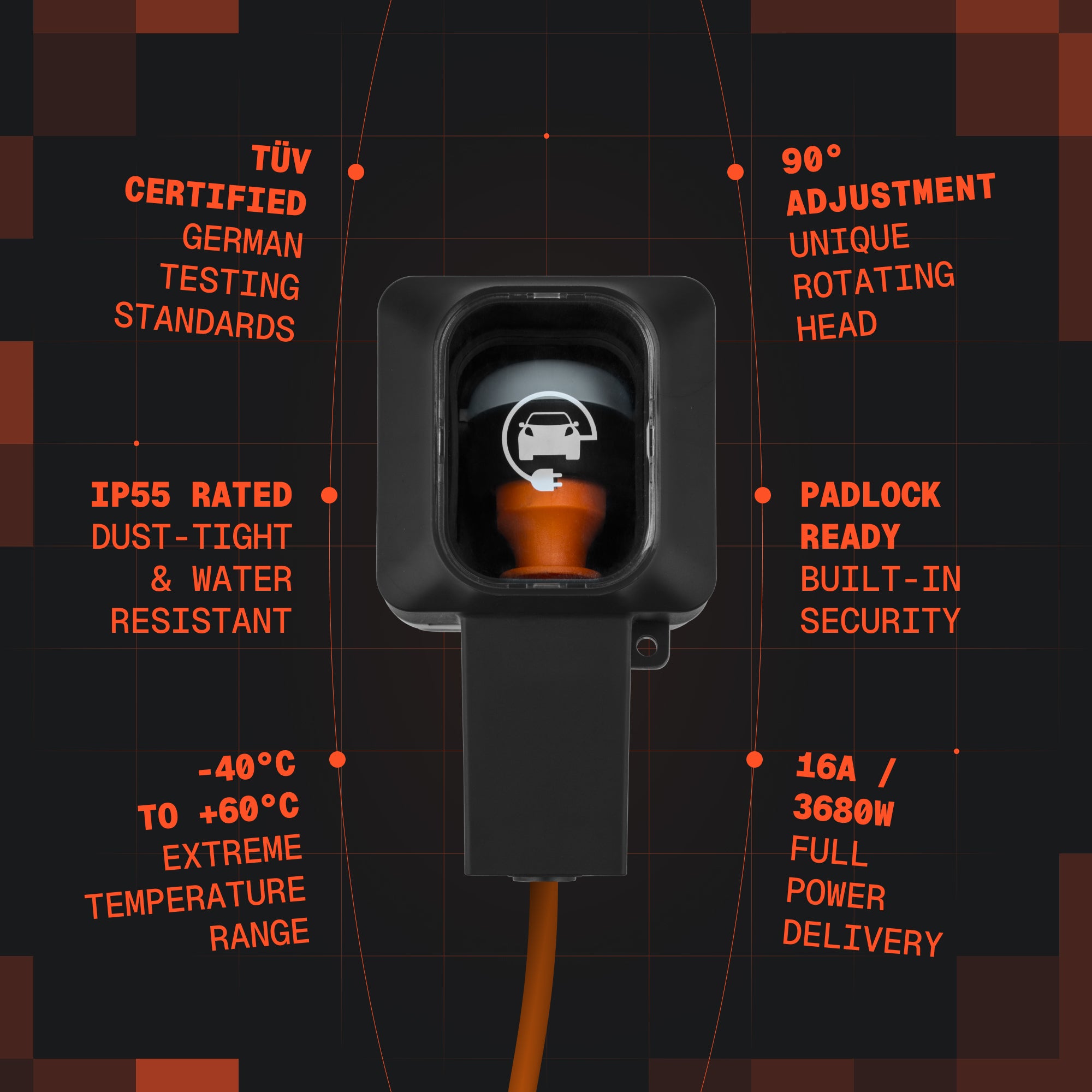 Навіщо згинати кабель зарядного пристрою за 1500 PLN, якщо можна регулювати розетку? Dr. Storm Socket — революційна зовнішня розетка для зарядки електромобілів, створена для екстремальних умов. Як єдина розетка на ринку з регульованою головкою під кутом 90°, вона усуває напругу на кабелі та захищає штекери від пошкоджень. Завдяки системі безпеки з навісним замком і сертифікації TÜV вона гарантує безпеку в будь-якому середовищі — від арктичних морозів до спекотних буревіїв.