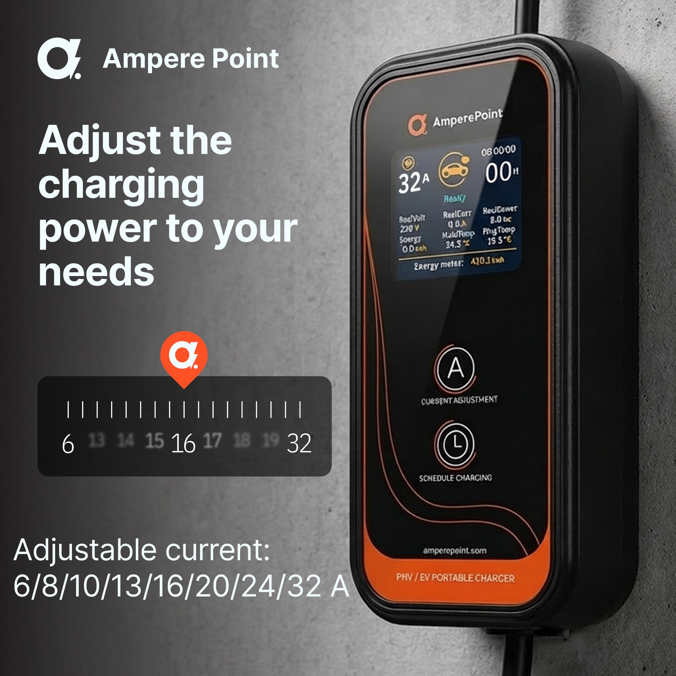 Регульована потужність зарядки (A: 8/16/20/24/32) та можливість планування для оптимізації споживання енергії у непікові години.