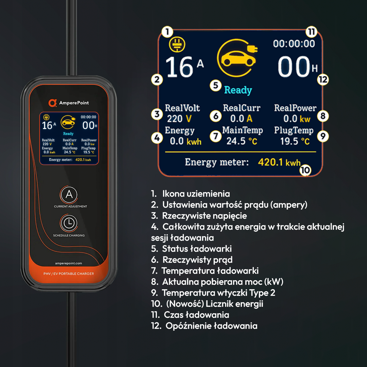 Регульована потужність заряджання (A: 8/16/20/24/32) та опція планування для оптимізації споживання енергії в години поза піком.